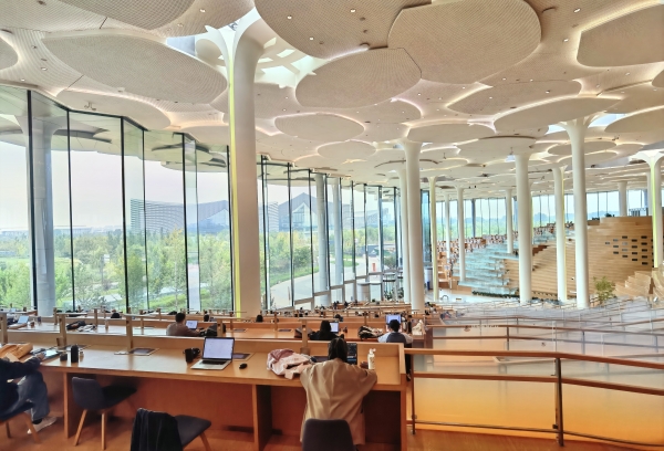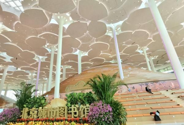随后,大家来被誉为最美图书馆的北京城市图书馆参观游览。图书馆以“森林中的图书馆”为设计理念,144根树形柱结构如同银杏树干,银杏叶屋盖汇成赤色方正的人文印章,营造出自然与人文交融的阅读氛围。这座融合了自然之美与人文之韵的现代建筑,宛如一座知识的灯塔,矗立在城市副中心的怀抱中。