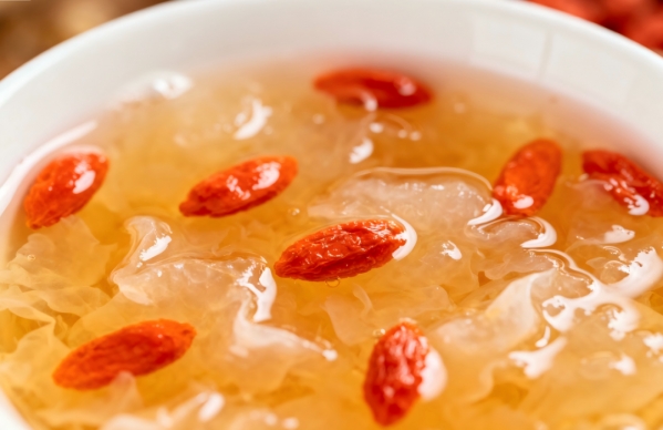 (4)加入枸杞、冰糖,再煮5分钟即可。可搭配百合、莲子同煮。