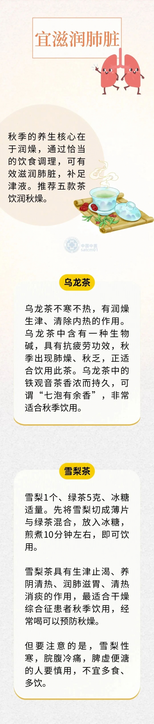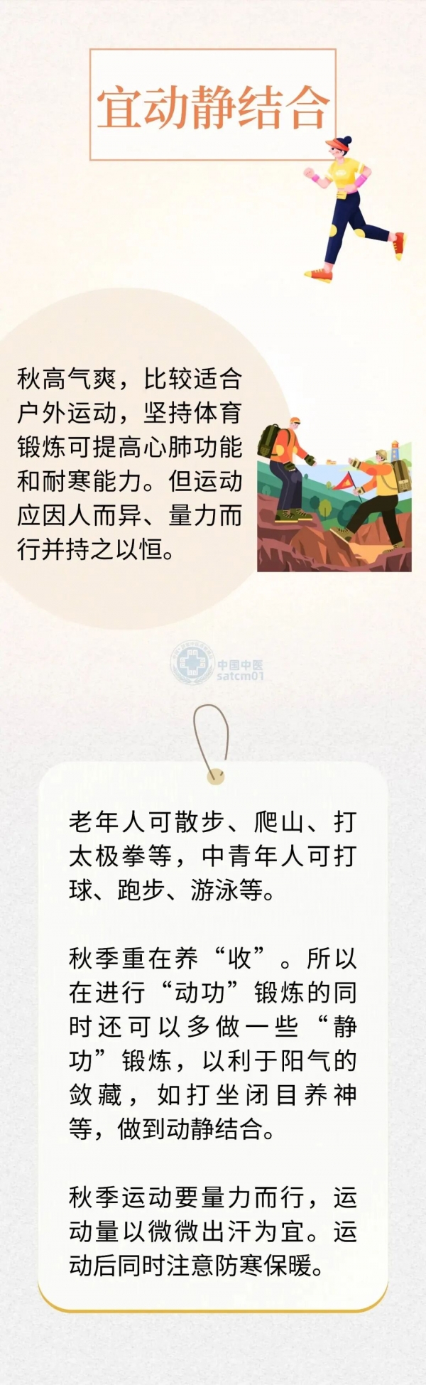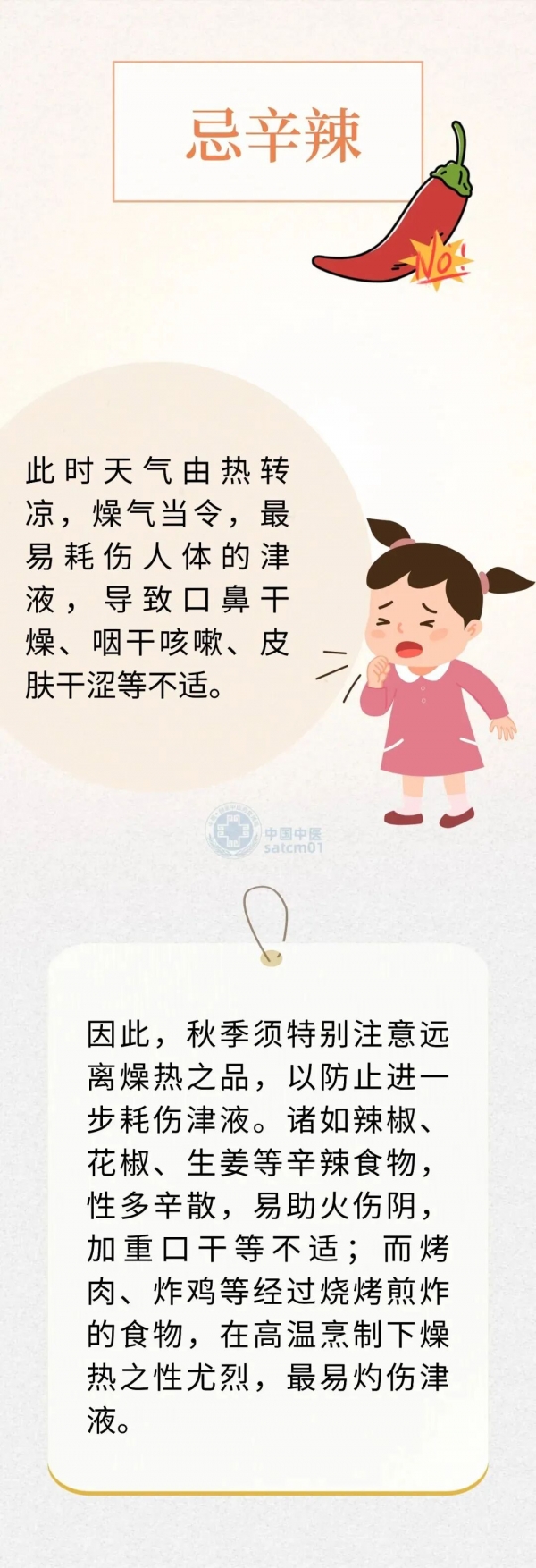 俗话说:“春生夏长,秋收冬藏。”秋天是收获的季节,天气由热转凉,人体也进入一个调整和适应的阶段。空气中的水分减少,容易让人感觉口干、皮肤干。从中医角度看,秋季五行属金,在气候上与“燥”对应,在五脏上与“肺”对应,人体最易感受的就是秋燥。此时,养生应以防秋燥、润肺为重点,为即将到来的冬天打好基础。因此,牢记秋日养生的“三忌““三宜”,尤为重要。